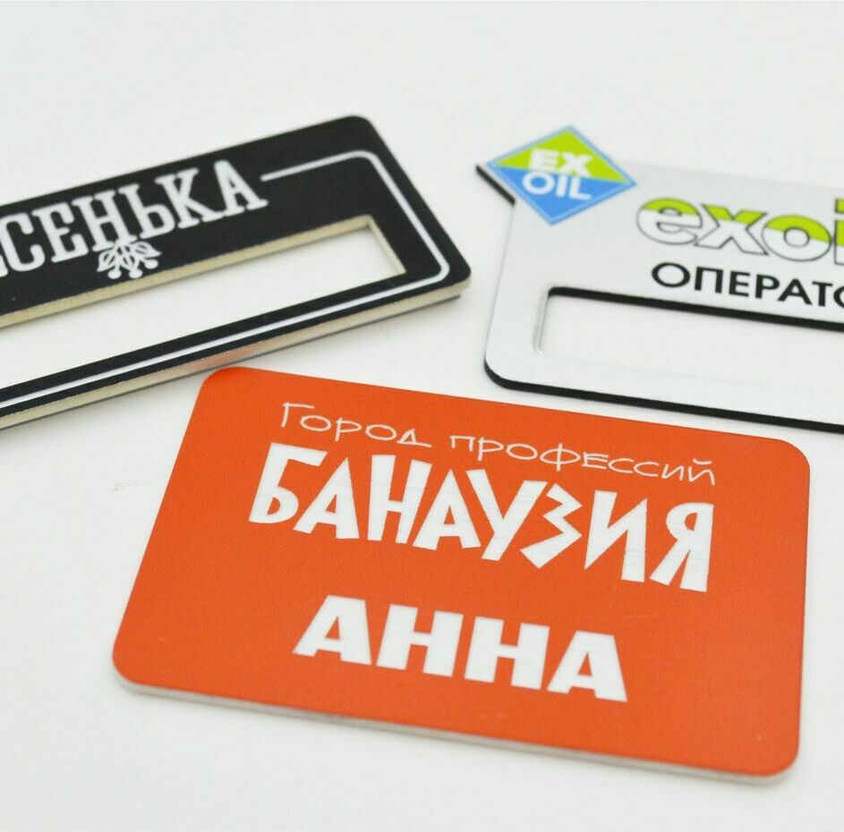 - На последнем этапе бейджу прикрепляется магнит или шнурок, чтобы его можно было закрепить на одежде работника.